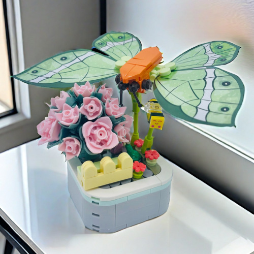 花儿蝴蝶蜻蜓盆栽花束造型益智拼装积木创意摆件